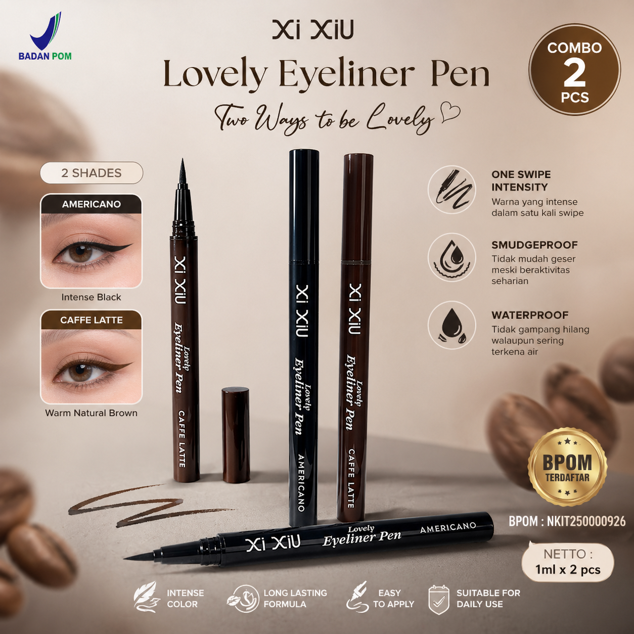- Bundling 2in1 - Americano & Caffee Latte: satu pembelian langsung dapat dua eyeliner pen = Americano - Natural Black & Caffee Latte - Warm Natural Brown